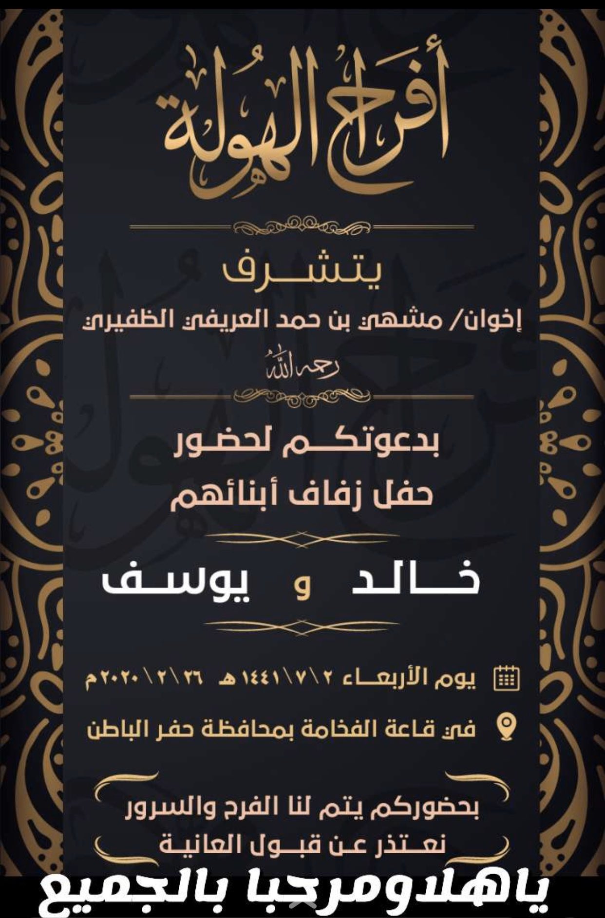 لايف الظفير On Twitter لايف الظفير يتشرف اخوان مشهي بن حمد الهوله الظفيري رحمه الله بدعوتكم لحضور حفل زفاف ابنائهم خالد يوسف بتاريخ 26 2 في حفر الباطن