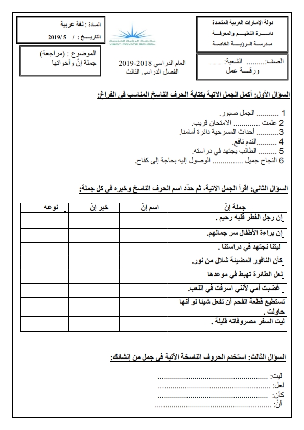 ورقة عمل جملة ان وأخواتها للصف الخامس لغة عربية الفصل الثالث