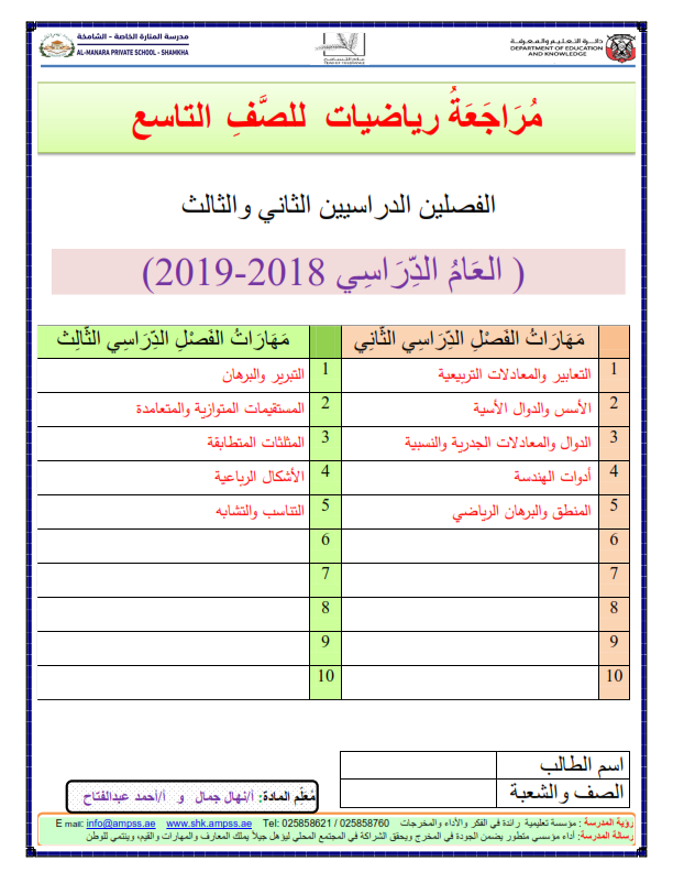 أوراق عمل مراجعة في الرياضيات المتكاملة للصف التاسع الفصل الثاني و الثالث