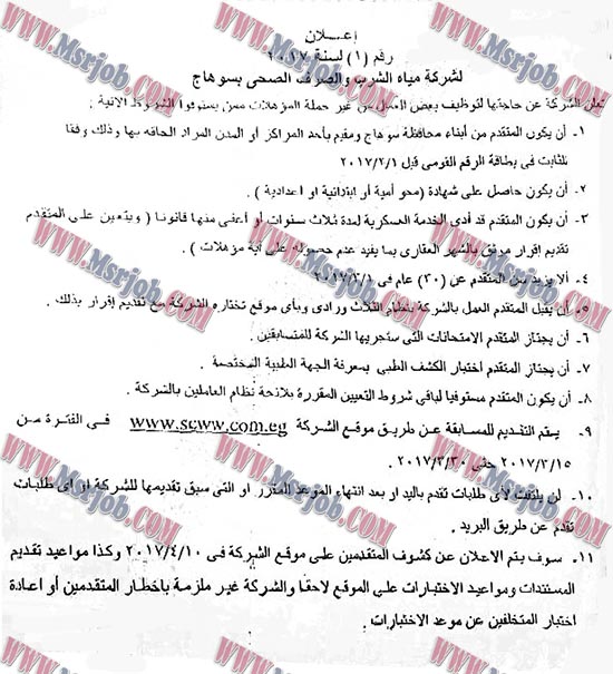 وظائف شركة مياه الشرب جميع المؤهلات 2017.